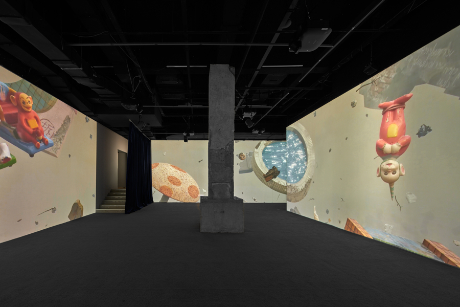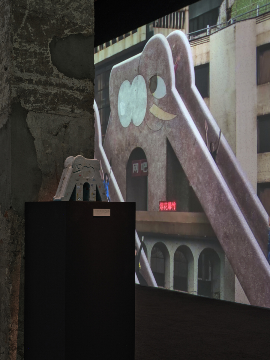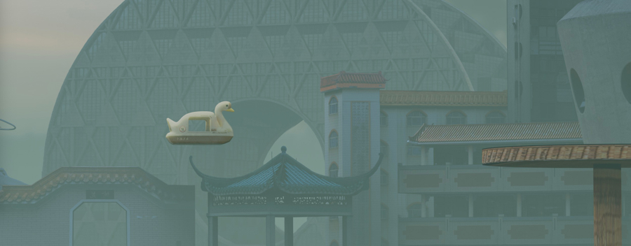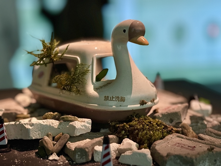 展览核心叙事围绕“旧白天鹅号”的奇幻旅程展览,讲述中山公园被拆除后,一艘老式游船接走最后一位乘客——静月雕塑女神的故事。观众将跟随这艘时光之船,穿梭于秃力城的各个奇幻场景,最终回到公园开业的那一天,完成一个关于城市记忆的时空循环。他创造了一个在混乱中自洽运行的虚拟都市景观,以哲学式的建造方法,将现实世界的各种社会规则和文化符号进行创造性的解构与重组,在数字空间里构建出一个既荒诞又真实的“赛博故乡”。