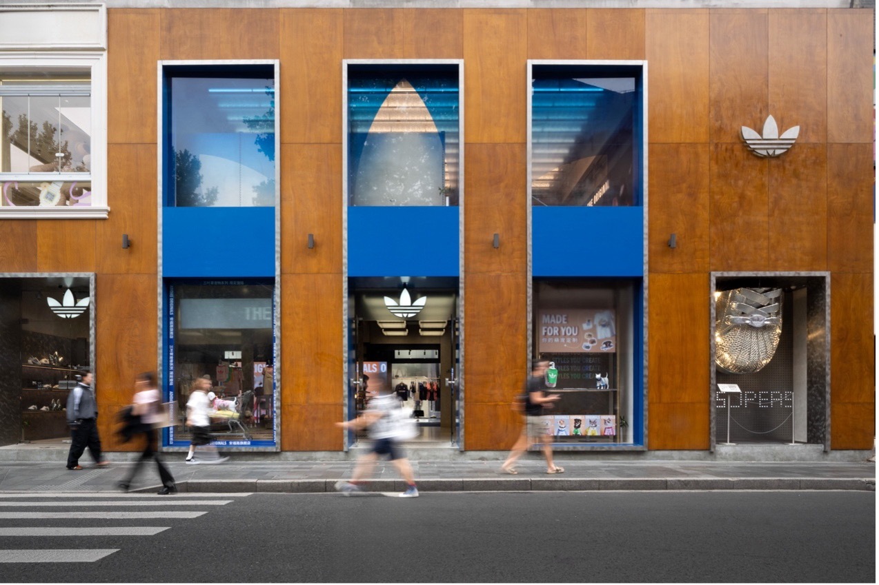 该旗舰店建筑的前身是电影院永乐宫,为此,品牌在门店外立面设计上保留了不少原址的特色,融合了影院美学和海派文化,在保留原有的建筑结构和外立面木饰面的基础上将经典三条纹和三叶草logo融入其中,并通过三个不同的橱窗展示产品。