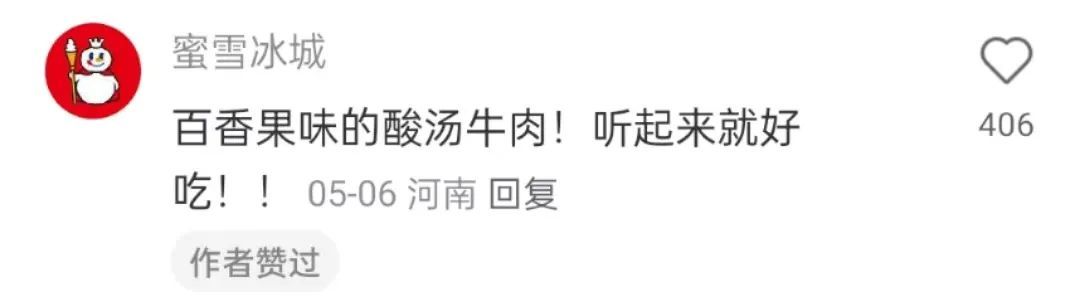 雪王官方更是亲自下场:“百香果味的酸汤牛肉!听起来就好吃!!”