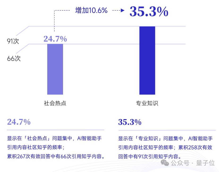 智库进一步分析发现,具体到社会热点话题下,AI智能助手引用知乎的频率是24.7%,而在专业知识问题集中,频率提升到了35.3%,增加10.6%。
