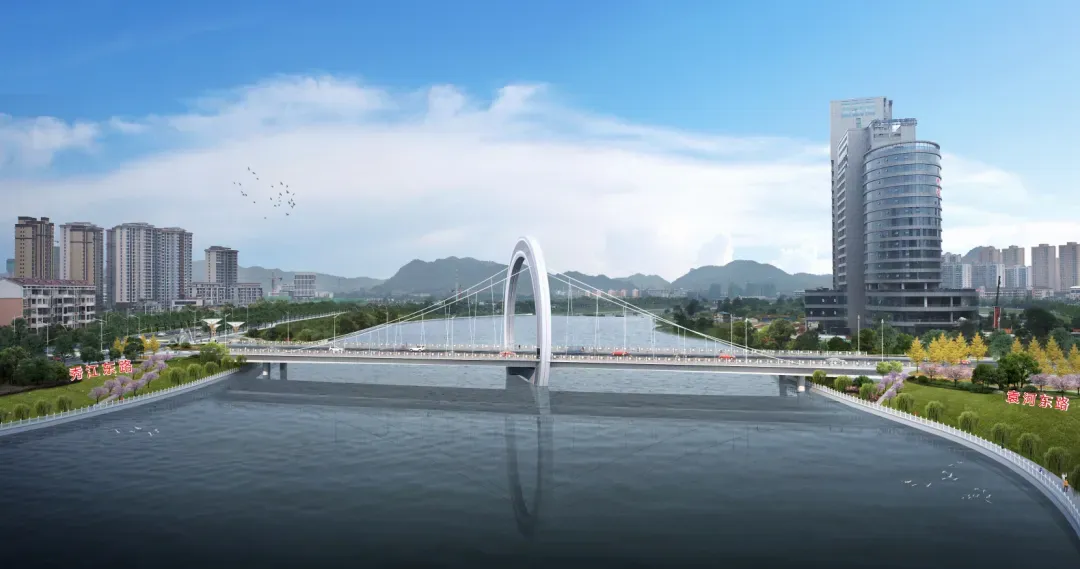 项目于2023年6月正式开工建设,工期两年,计划2025年6月竣工。主线全长778米,其中主桥为独塔自锚式悬索桥,桥长207米,宽42米,设计双向八车道加辅道和人行道。两岸道路改造主要包括袁河东路改造全长370.4米,秀江东路改造全长423.8米,宽度均为40.05米,车道数量显著增加,且设有地下通道,长度分别为241米和270米,宽度9米,有利于机动车快速通行。