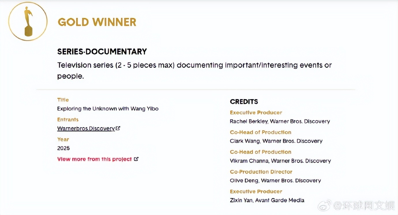 5月21日,据环球网文娱,有“美国电视界奥斯卡”之称的泰利奖( Telly Awards)公布2025年获奖名单,由王一博主演的纪录片《探索新境》获得金奖。