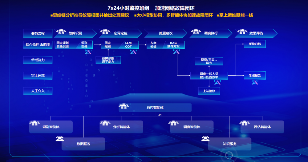 ·识别智能体:采用大小模型协同技术,1分钟内完成网络健康度评估、异常检测及事件摘要生成。