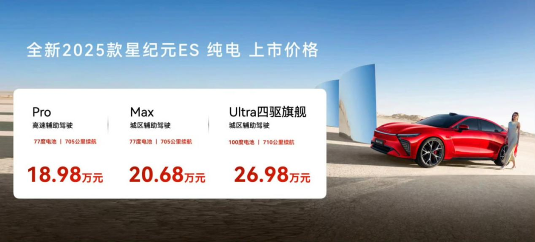本次新款星纪元ES纯电版共推出了3款配置车型,分别为Pro高速辅助驾驶版、Max城区辅助驾驶版以及Ultra四驱旗舰城区辅助驾驶版,价格区间为18.98-46.98万。