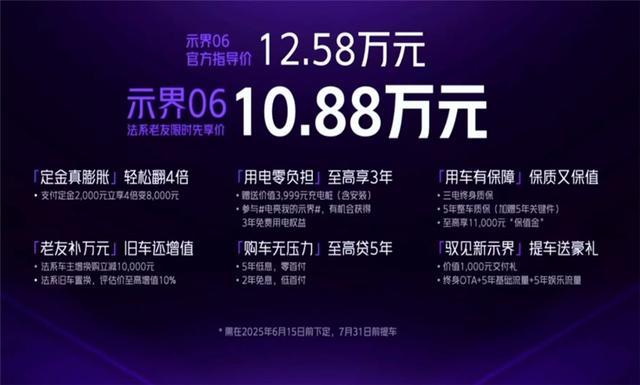 如果你是法系老车主,那么按照10.88万元的价格选购示界06,性价比就更高了。同样10万元级,铂智3X的入门款车型续航仅430公里,配置相对比较基础,没有L2辅助驾驶,塑料方向盘、织物座椅,座舱质感也是不如示界06的。整体来看,示界06的性价比还是比较高的,尤其是按照10.88万元的法系老友先享价来看,可以称得上合资纯电SUV中的新卷王之一了。