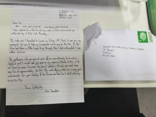△ 申请人向伦敦中国签证申请中心寄来感谢信