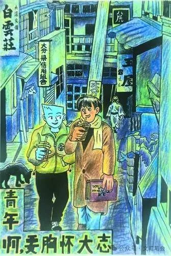 刘痒痒为《贫困旅行记》别册《致敬柘植义春》所绘的封面《青年啊,要胸怀大志》(致敬《义男的青春》,和青年义春喝着咖啡走在汤平小镇的路上)