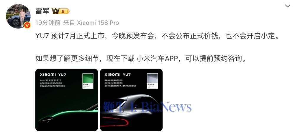 5月22日,雷军在微博上发文称,小米YU7预计7月正式上市,今晚预发布会,不会公布正式价钱,也不会开启小定。