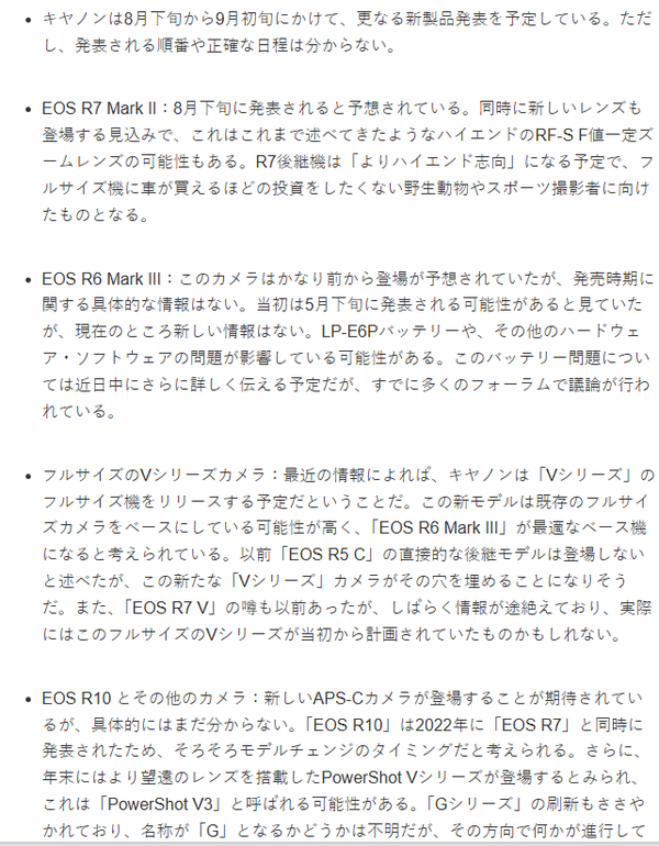 此外,APS-C相机方面,预计会有新机型发布,但具体信息尚不明确。EOS R10于2022年与EOS R7同时发布,如今已到更新换代时机。2025年末,搭载更远摄镜头的PowerShot V系列相机有望登场,可能命名为“PowerShot V3”。同时,“G系列”也有更新传闻,虽名称是否仍为“G”尚不确定,但相关工作似乎正在推进。