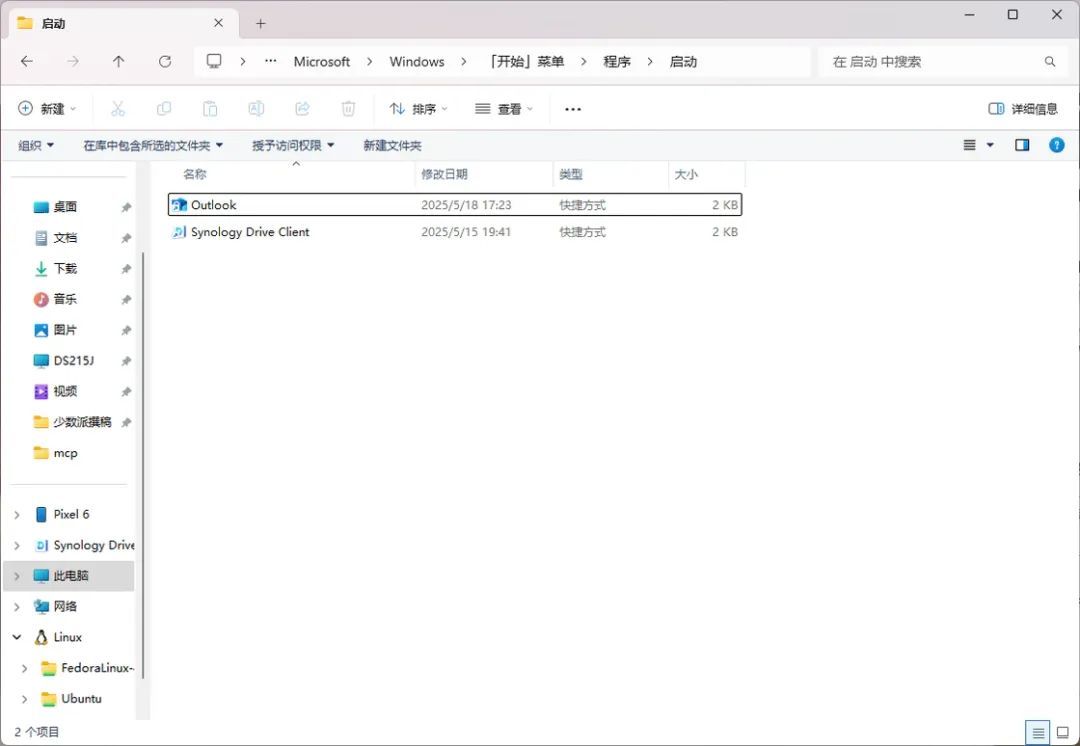 接下来我们回到 Windows 文件资源管理器,同样在地址栏输入 shell:startup 并回车,打开系统的「启动」文件夹——然后将放到桌面的 Outlook for Windows 的快捷方式拖入。