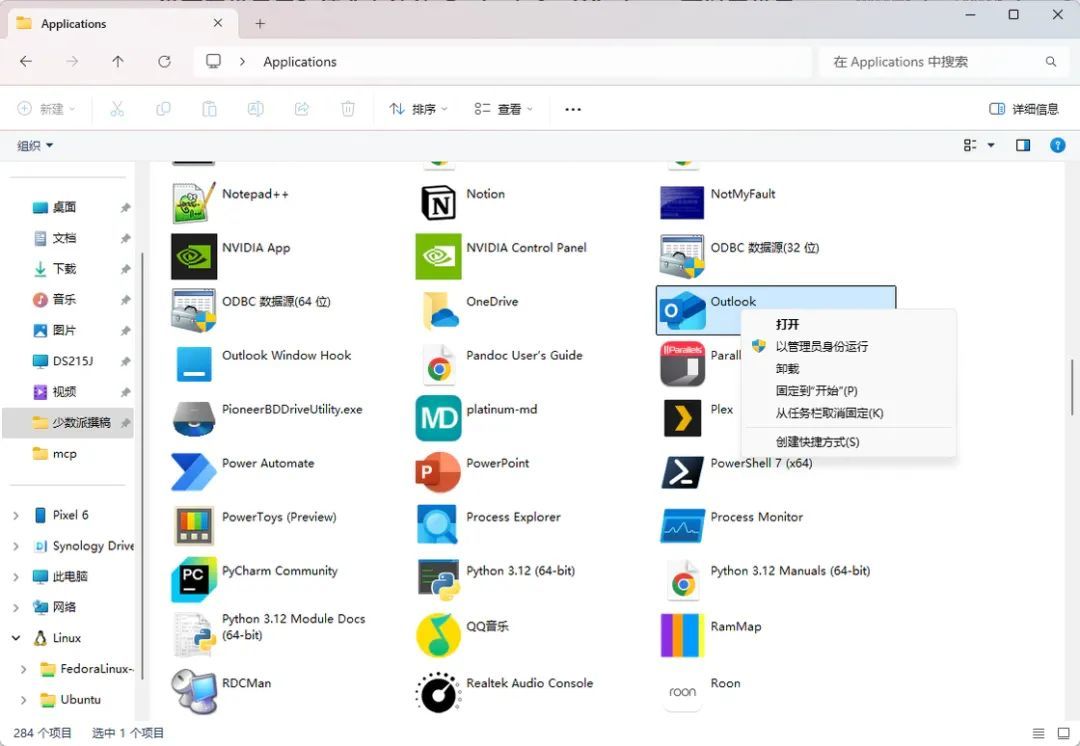 找到 Outlook 应用的图标,选中应用并点击鼠标右键,在右键菜单中选择「创建快捷方式」。此时系统会提示你无法在此处创建快捷方式是否需要放到桌面,点击是,然后桌面上就能看到 Outlook for Windows 的快捷方式了。