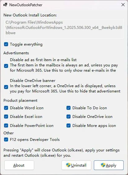 NewOutlookPatcher 可以直接禁用应用内广告,包括左下角 OneDrive 横幅、Web 版 Office 应用图标等,同时还能在 Outlook 应用内开启 F12 开发者工具。操作也非常简单:直接勾选需要处理的项目,然后点击 Apply 即可给 Outlook for Windows「打补丁」。