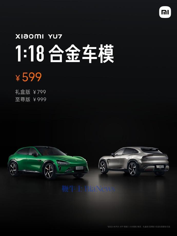 5月22日,小米YU7 1:18合金车模上线,售价599元,礼盒版售价799元,至尊版售价999元,可在小米汽车App、小米商城购买。