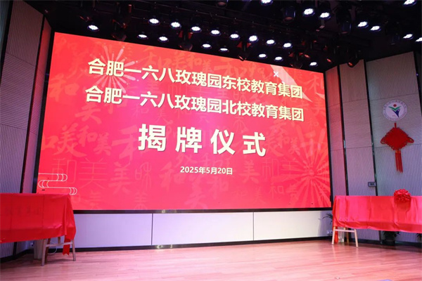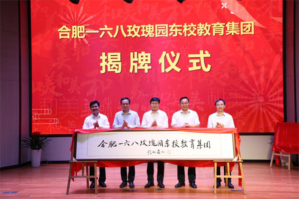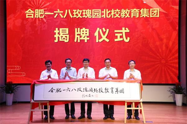 在掌声中,刘声、罗在兵、李丰尧、陈忠好、陈炳炎为合肥一六八玫瑰园东校教育集团和合肥一六八玫瑰园北校教育集团揭牌。