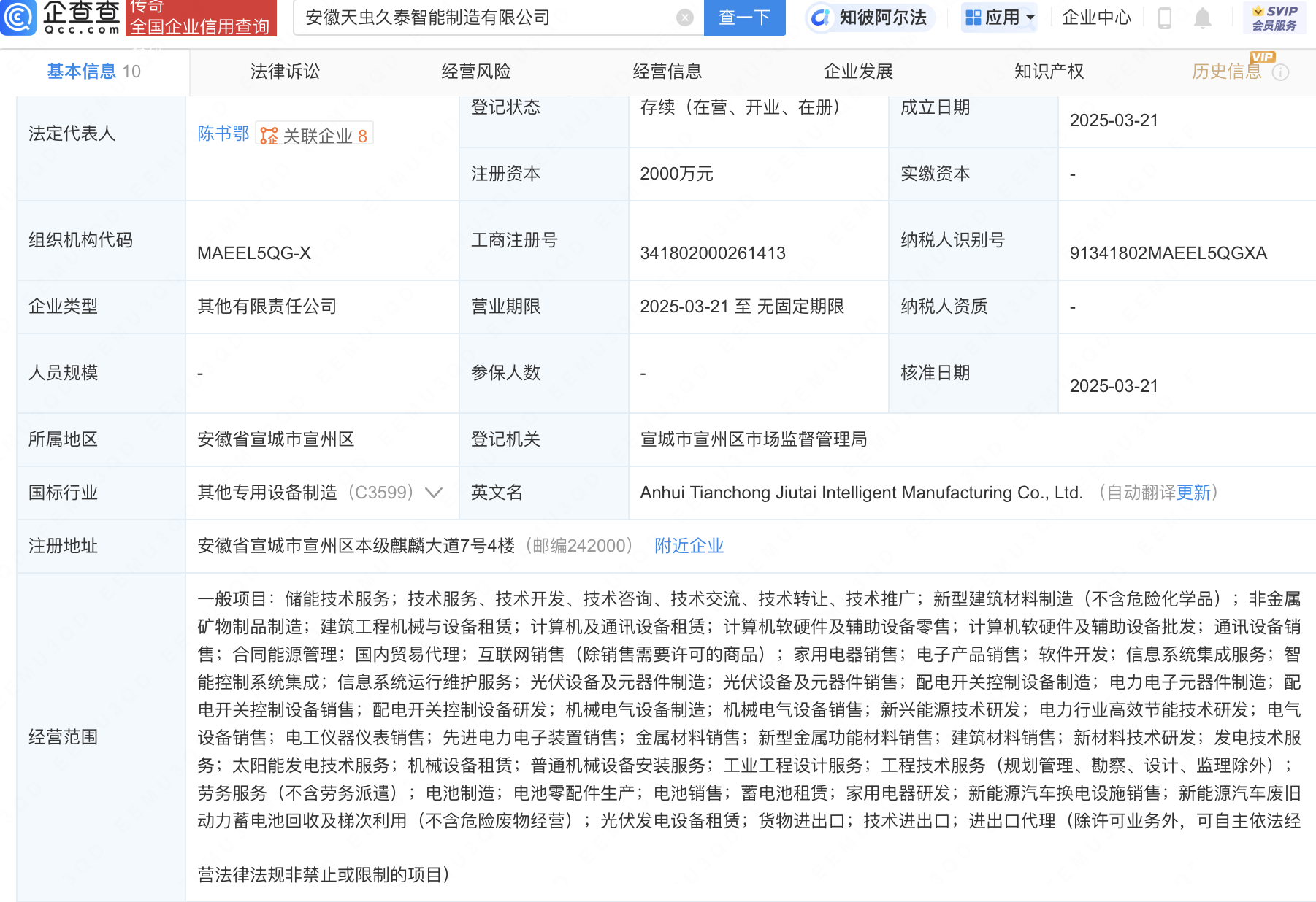 企查查APP显示,近日,安徽天虫久泰智能制造有限公司成立,法定代表人为陈书鄂,注册资本2000万元,经营范围包含:金属材料销售;新型金属功能材料销售;建筑材料销售;新材料技术研发等。企查查股权穿透显示,该公司由宏润建设(002062)全资子公司宏润新能源投资有限公司等共同持股。