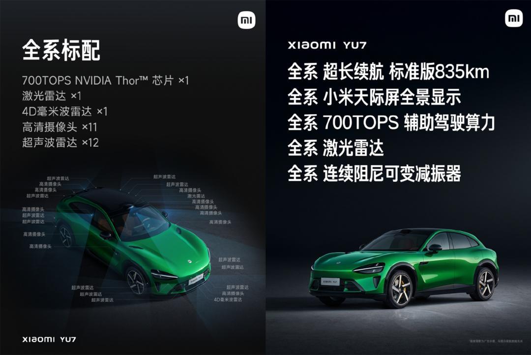 YU7有“四重制动安全机制”、“更安全的制动性能”, “50项被动安全性能开发测试”......全系标配激光雷达、4D毫米波雷达、英伟达Thor-U,更清晰的摄像头等,最终的目的还是让“驾驶更安全”。
