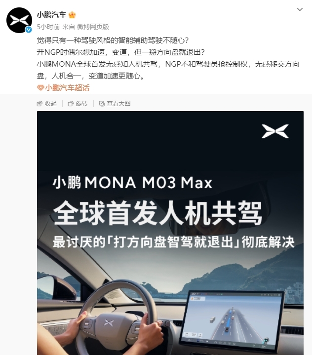 站长之家5月23日 消息:5月23日,小鹏汽车官方正式宣布,旗下小鹏MONA M03Max车型将率先在全球范围内推出无感知“人机共驾”功能。这一创新技术的核心亮点在于,用户在启用智能辅助驾驶系统后,即便手动转动方向盘,系统也不会自动退出智能驾驶模式,此举有望大幅优化用户的驾驶体验。