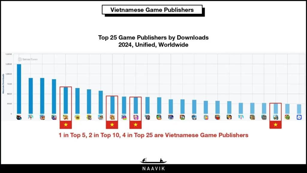 iKame的崛起也让人联想到近年来越南厂商的不断突破。据外媒Naavik统计的报告,2024年有5家越南厂商进入了全球手游发行商下载榜TOP25,分别是VNGGames、iKame Games、ABI Games Studio、Bravestars Games和Xgame Global。
