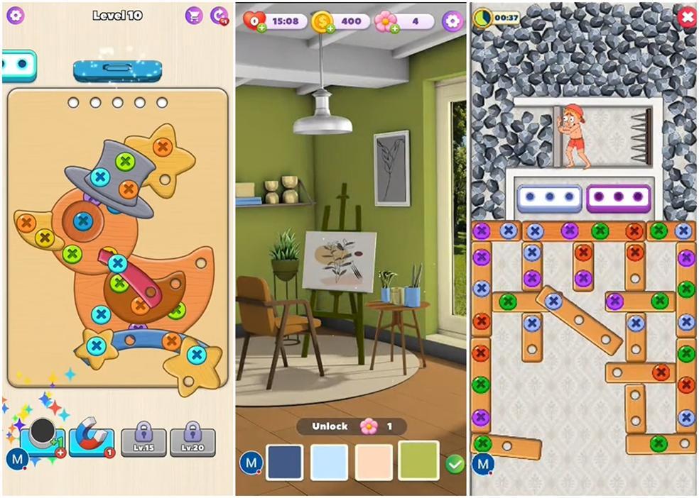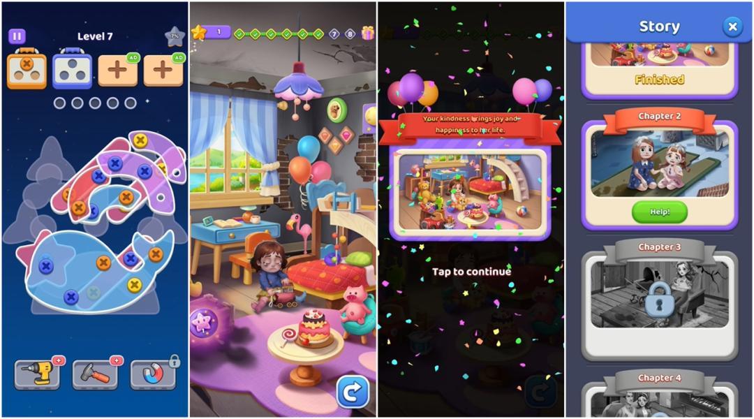 《Screw Out Master》《Family Savior: Screw Puzzle》则在打螺丝闯关的基础上,添加了消除品类经常出现的「家装/剧情」环节。