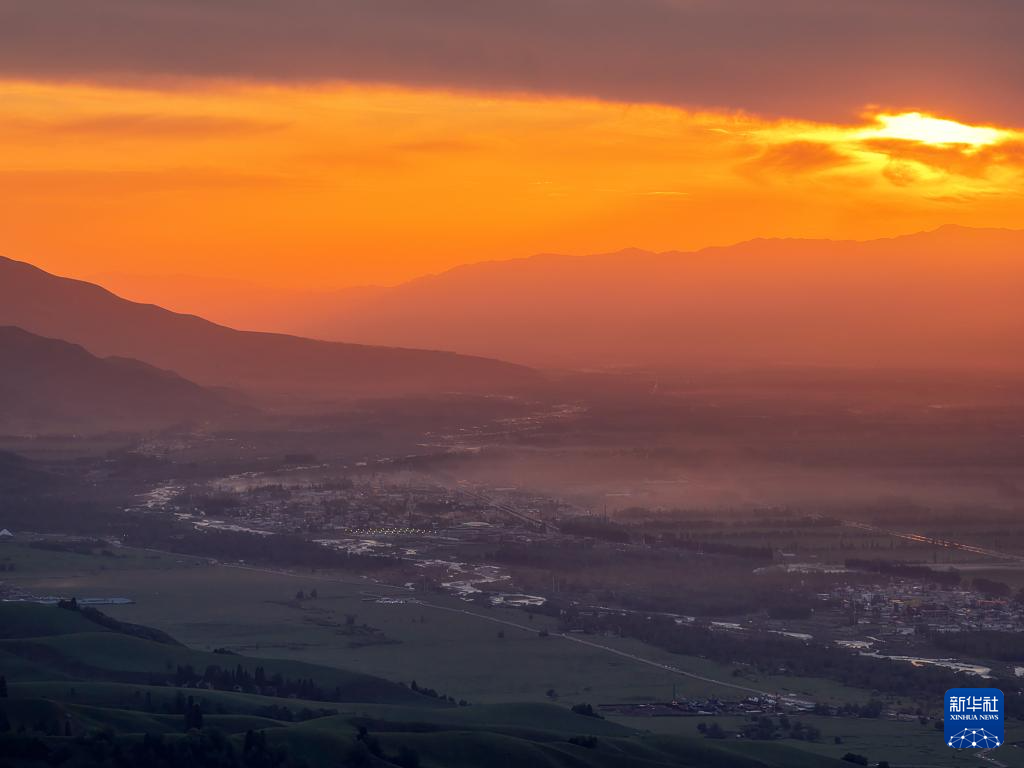 5月22日拍摄的夕阳下的那拉提镇(无人机照片)。