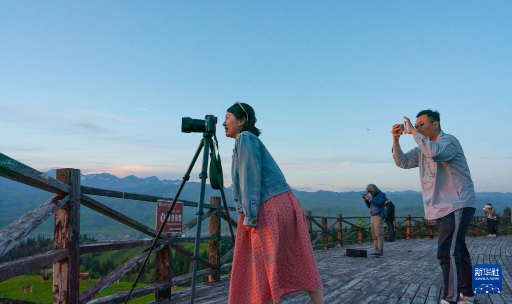 5月22日,在新疆那拉提景区一处观景平台,摄影爱好者拍照留念。