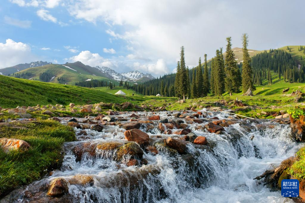5月23日清晨,那拉提草原上的溪流奔涌。