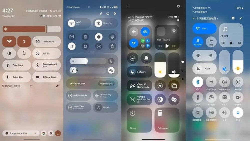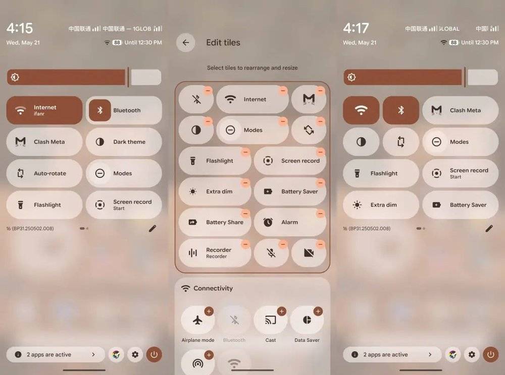 Android 16新版的快捷设置面板虽然可以自定义,但是因为Android 16只为快捷开关提供了两种尺寸,没有iOS 18中2×2的大尺寸按钮可以选择,因此调整的空间仍然是相当有限的。
