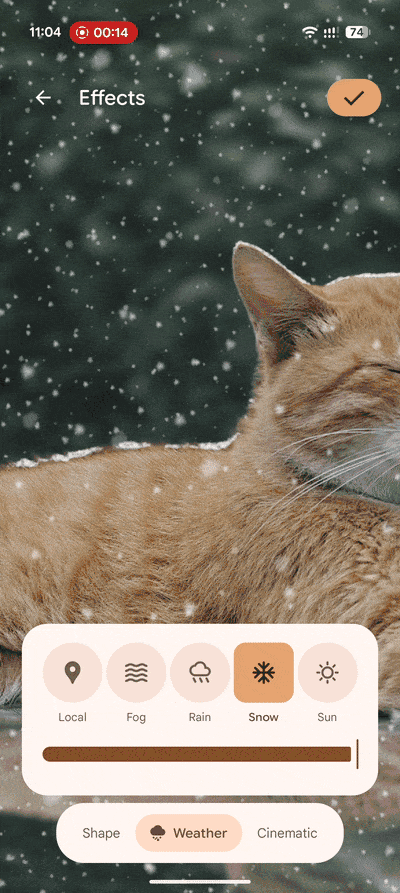 天气效果的来源则更加古老一些,类似的设计甚至可以追溯到曾经的HTC Sense上。在Android 16中,谷歌提供了包括实时天气在内的五种固定的样式,不仅会在主体的边缘产生拍打或堆积的特殊效果,还可以调整效果的强度: