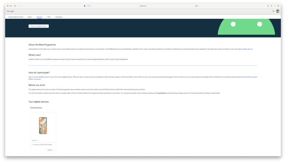 如果阅读到这里的你也想尝试最新的Android 16测试版系统,可以在Android Beta Program网站注册自己符合测试条件的Pixel设备,随后就可以通过OTA直接升级到最新的beta版本了。