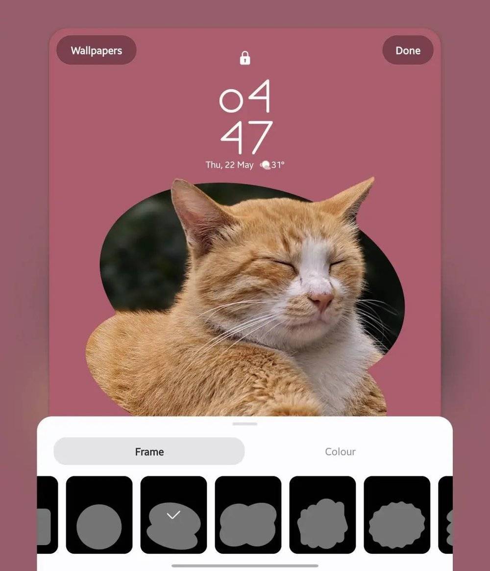 其中镂空图形的效果可以说是姗姗来迟,因为它就是此前OneUI 7和Color OS中出现过的“相框”风格锁屏,通过智能分离照片前后景并添加纯色边框,这个功能可以规避构图缺陷、拯救很多原本不适合做壁纸的照片。