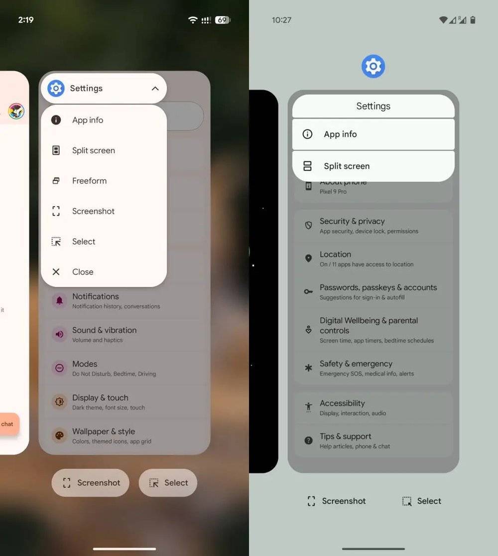 而多任务界面也一改谷歌以往的图标居中设计,变成了app图标与全称以药丸的样式悬浮在卡片的左上角,展开的功能菜单也被重新设计,虽然展示的信息比Android 15更多,但是变长的列表和缩小的字体却让易读性有所下降。