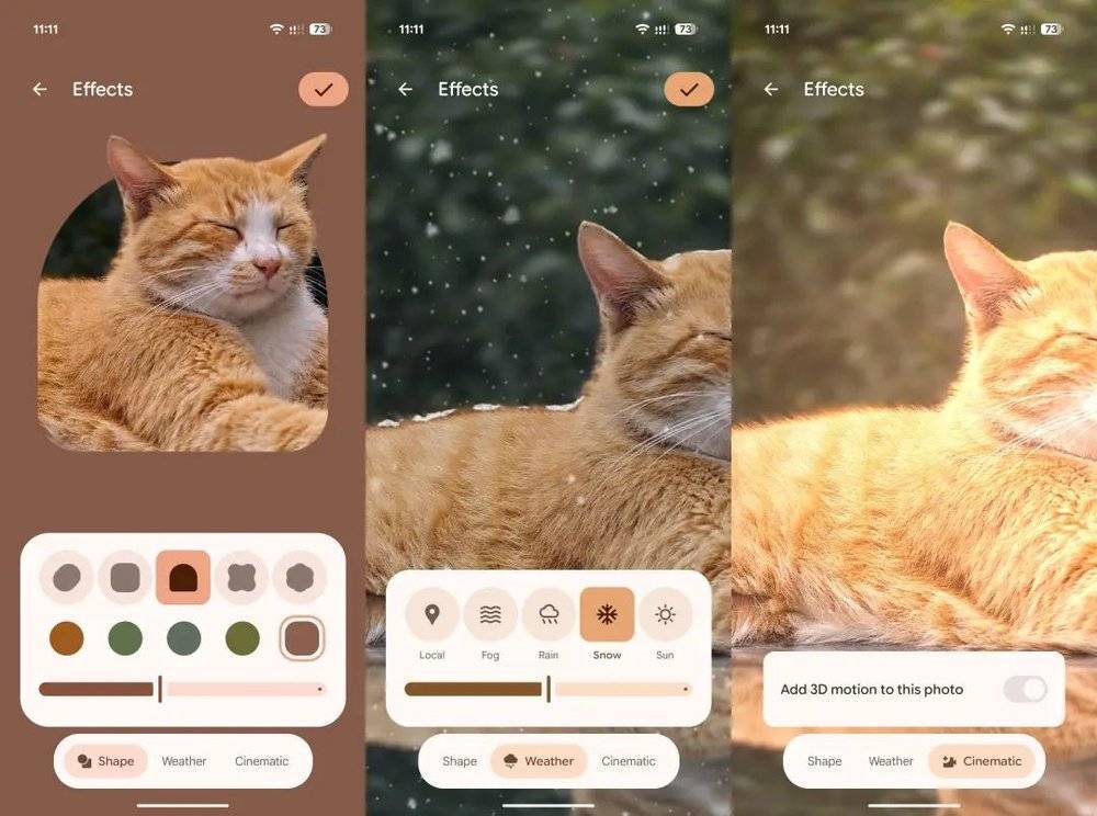 壁纸以及基于壁纸的色彩方案一直都是Material Design 3的重点,Android 16也同样对壁纸的个性化功能进行了加强。现在从相册里面选择图片之后,壁纸预览界面下方会出现一个“效果”按钮,点击进入后手机就会自动对壁纸进行主体分离,然后提供三个不同的效果以供应用——镂空图形,天气效果,以及分离景深。