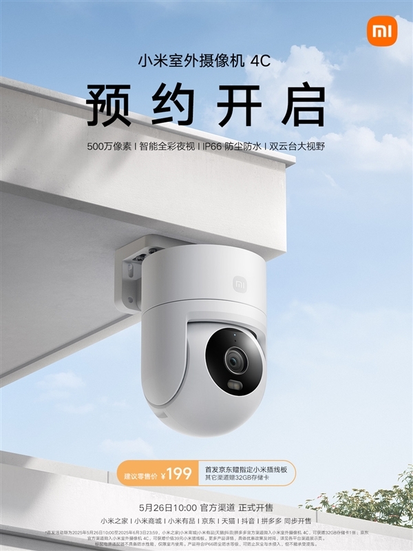 快科技5月24日消息,小米最新推出了小米室外摄像机4C,目前已经开启预约,将于5月26日早10点正式开售,建议零售价199元。