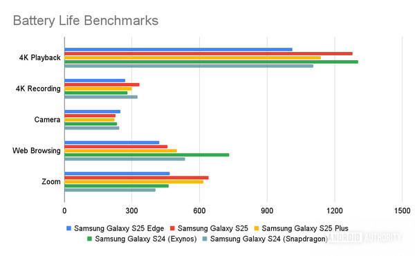 具体而言,根据外媒的测试,Galaxy S25 Edge的持续拍摄续航时间约为4个多小时,中等强度使用(例如网页浏览和视频通话)续航时间可达7到8小时,离线4K视频播放续航时间则可达17小时。这些数据单独来看并不算糟糕,但比同类产品慢了一两个小时。并且外媒还特别强调,这仅仅是在理想的开箱即用条件下得出的结论。如果再加上后台任务、高流量使用或游戏,续航时间就会迅速下降。