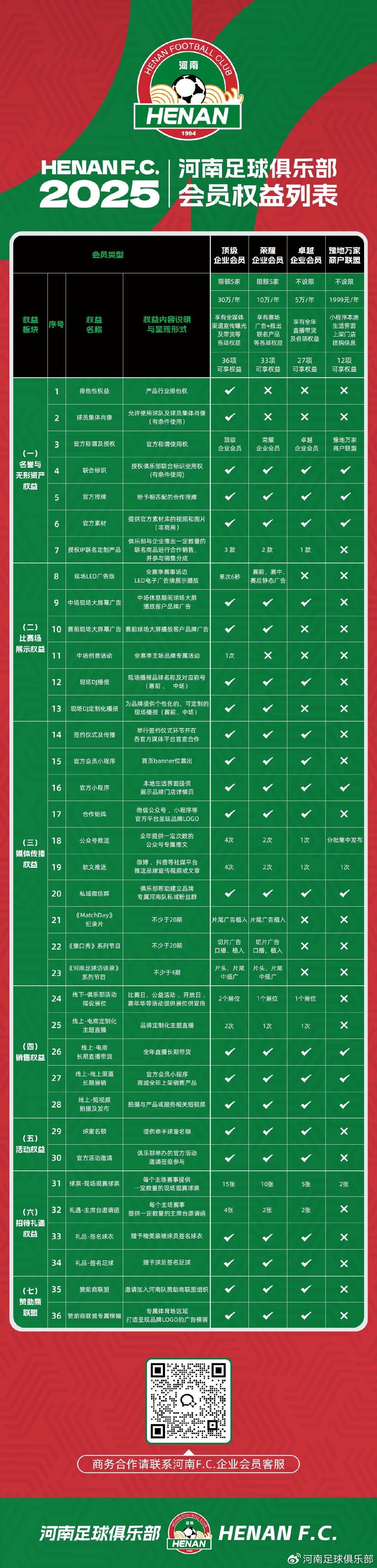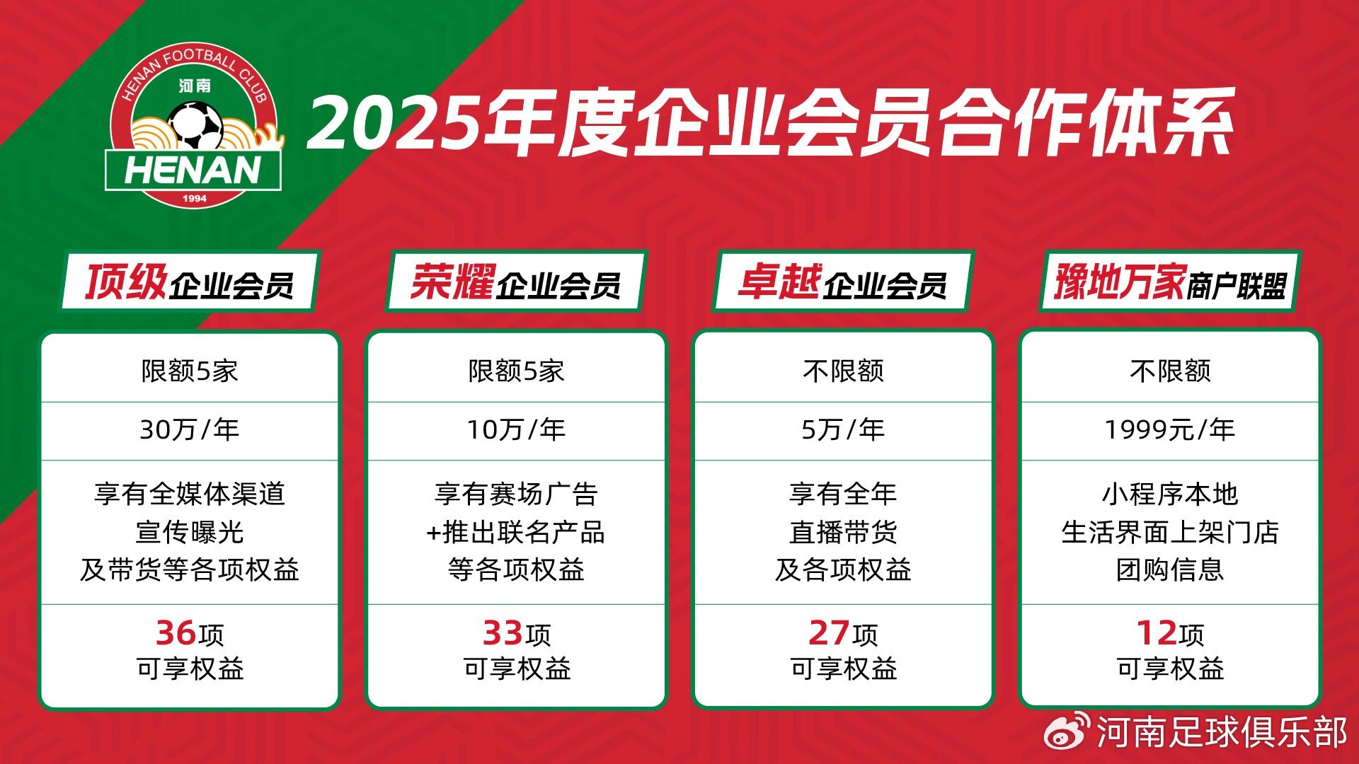 现河南足球俱乐部面向全社会发布2025年度企业会员合作体系。诚邀您的加入,配套权益及服务方案视具体敲定时间开放洽谈。希望与您在未来携手共进,合作共赢,一起推动河南足球事业迈向新高度,为中国足球发展注入力量!