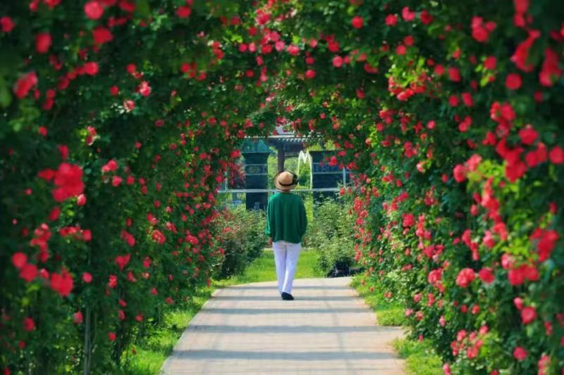在城市空间重构中,大兴区依托“花园式街区”“城市画廊”“花园乡村”等建设工程,将“首善之花”“纳波湾”等专利品种植入口袋公园、小微绿地,重塑城市肌理,让市民在家门口就能感受到月季的芬芳,形成了“推窗见花海,转角遇艺术”的宜居场景。同时,用花卉激活桥下“灰空间”,京九铁路沿线13万平方米灰色地带蜕变为生态走廊,1.3万株花卉及乔灌木与开花地被形成“春览繁花、夏享绿荫、秋观彩叶、冬赏枝艺”的四季景观长卷,让疾驰的列车化作“开往春天的专列”。兴丰大街、新源大街等交通动脉两侧,10万余株藤本月季攀缘成瀑,形成“车行画中游,人在景中驻”的沉浸式体验。