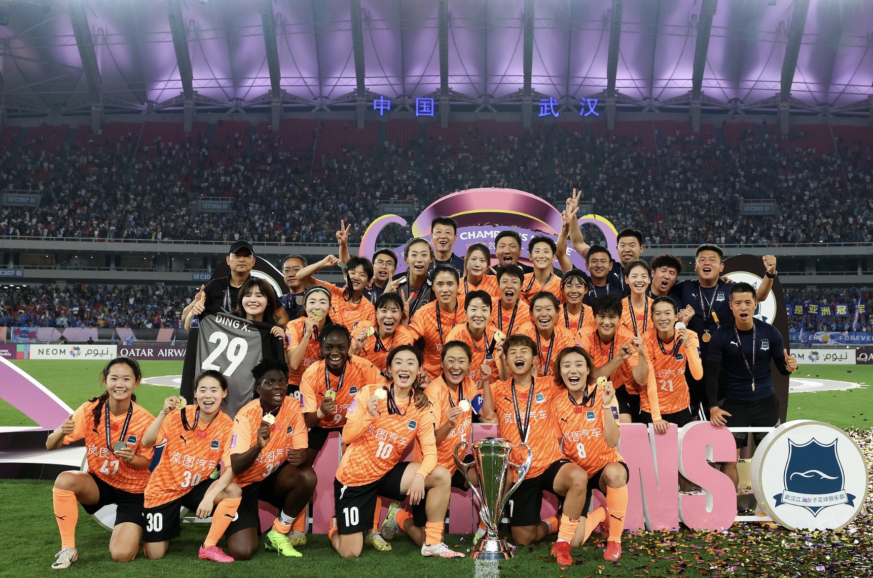 北京时间5月24日,武汉女足点球战胜墨尔本城女足夺得首届女足亚冠冠军。其中扑点功臣陈晨在下半场替补首发门将丁旋登场,因伤下场的丁璇的29号球衣出现在了夺冠合影中。