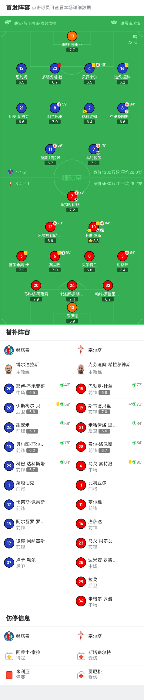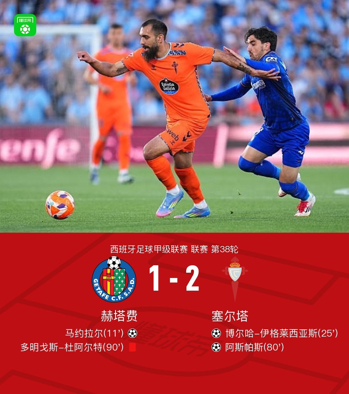 北京时间5月25日,西班牙足球甲级联赛第38轮,赫塔费主场迎战塞尔塔。比赛中,赫塔费由马约拉尔攻入一球取得领先。随后,塞尔塔凭借博尔哈-伊格莱西亚斯的进球扳平比分,阿斯帕斯再入一球完成反超。比赛尾声,赫塔费一方有一名队员被红牌罚下。最终,赫塔费1-2不敌塞尔塔。