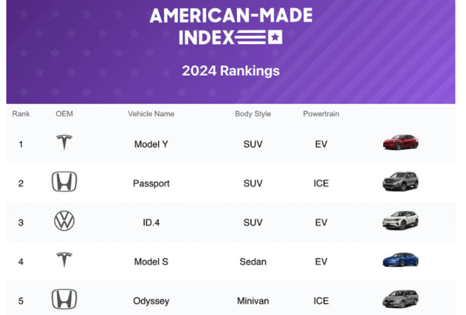 2024年“美国制造指数”前五名,福特通用榜上无名