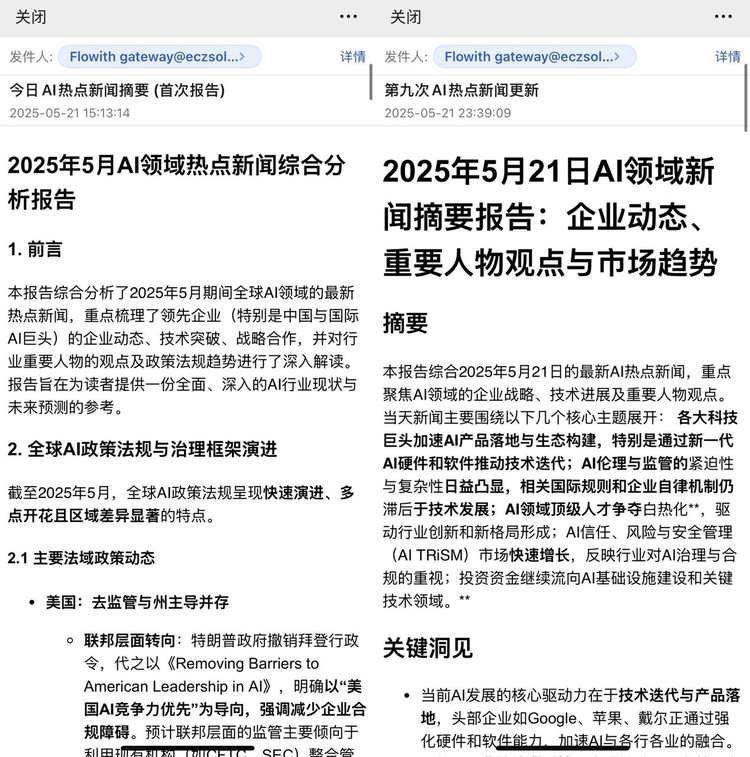 我们同时在几个主流 Agent 产品上测试了相似任务。结果显示,只有 Flowith 的 Neo 能够持续不断地执行信息搜集,并且按照指令,定期将整理好的新闻摘要发送到指定邮箱。