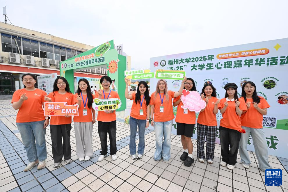 5月25日,在福州大学心理嘉年华活动上,福州大学“小福心”心理健康服务社团成员展示心理健康宣传标牌。