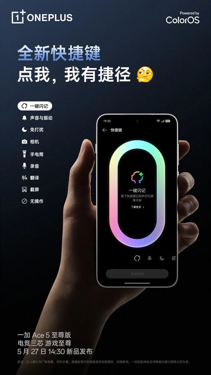 一加Ace5 至尊系列新机将于5月27日下午14:30正式发布。近日,@一加手机 发文表示,新机搭载了全新快捷键,可支持一键闪记,该按键位于机身左侧靠上的位置,可通过系统设置对按键功能进行设置。