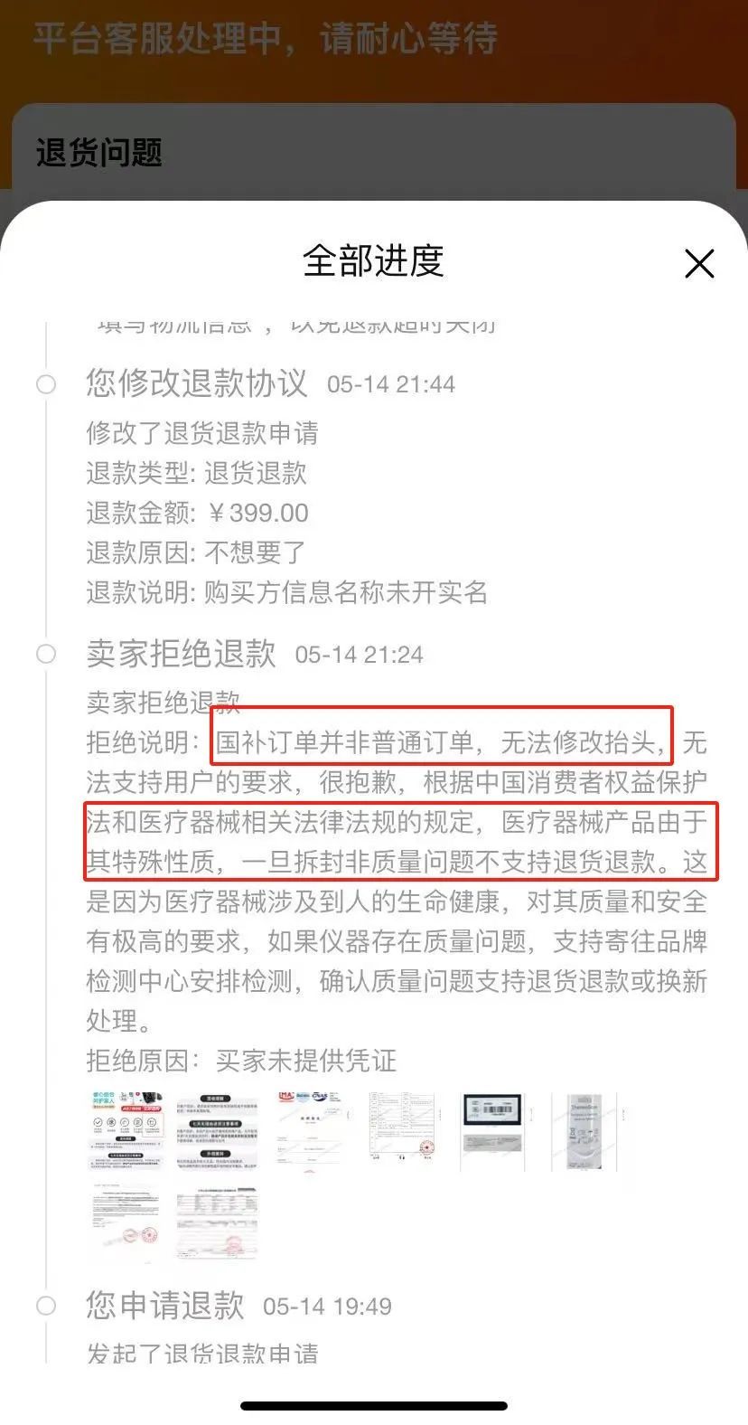 徐女士这一等就是好几天,结果发票抬头还是“个人”二字没改过来。5月14号,徐女士以“发票抬头无法正确开具”为由申请退货。商家以“国补订单无法修改抬头”为由拒绝了。她又申请7天无理由退货,商家接着以“医疗器械商品一旦开封非质量问题不支持退货退款”再次拒绝,徐女士既生气又无奈。