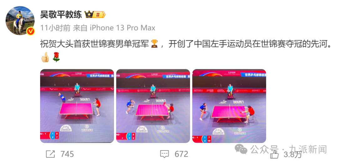 赛后,央视盛赞:“这是王楚钦从顶尖到王者的蜕变!”吴敬平教练也发文称 :“开创了中国左手运动员在世锦赛夺冠的先河。 ”