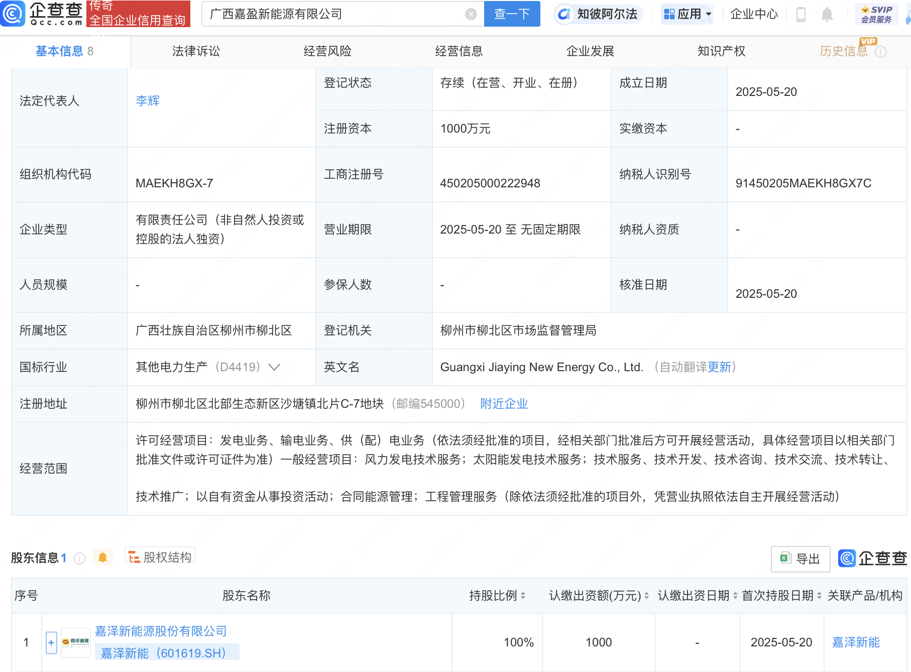 企查查APP显示,近日,广西嘉盈新能源有限公司成立,注册资本1000万元,经营范围包含:以自有资金从事投资活动;合同能源管理;工程管理服务等。企查查股权穿透显示,该公司由嘉泽新能(601619)全资持股。