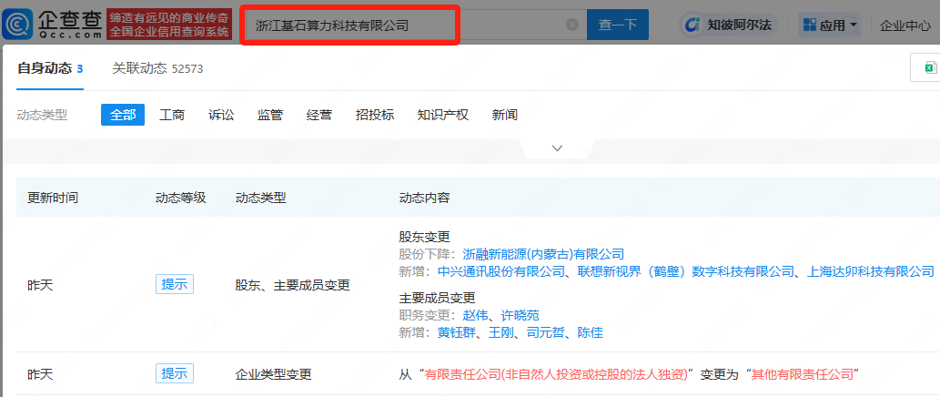 企查查APP显示,近日,浙江基石算力科技有限公司发生工商变更,新增股东中兴通讯(000063)、联想新视界(鹤壁)数字科技有限公司、上海达卯科技有限公司,同时,公司主要人员亦发生变更。
