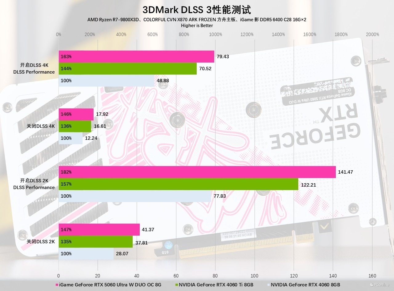 首先是3DMark的DLSS 3性能测试。iGame GeForce RTX 5060 Ultra W DUO OC 8GB在2K分辨率下,对比RTX 4060,性能提升幅度非常夸张,达到了82%,对比RTX 4060 Ti则是25%;4K分辨率下,开启DLSS 3以后,对比RTX 4060性能领先也基本维持在80%以上,而对比RTX 4060 Ti同样拉开了不小的差距,接近40%的性能提升只能说老黄确实有点东西。