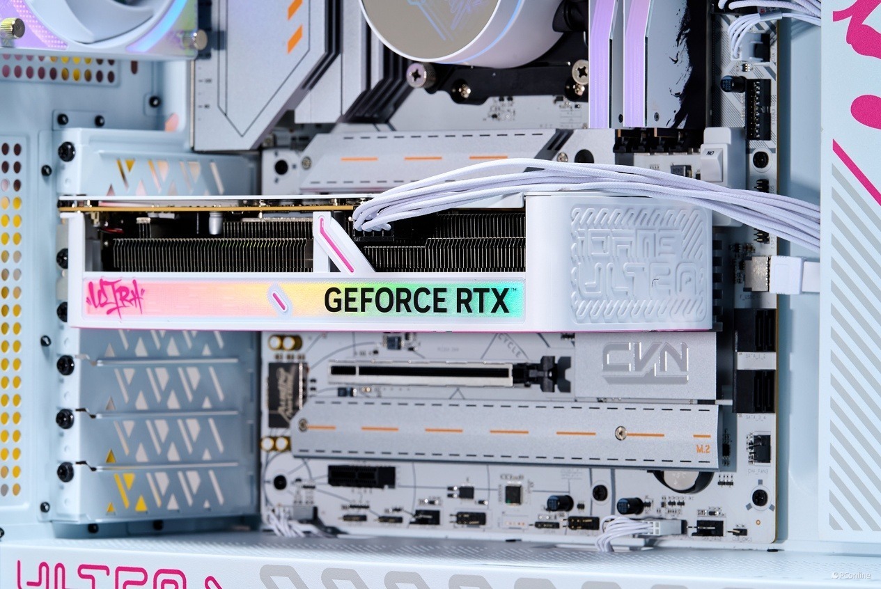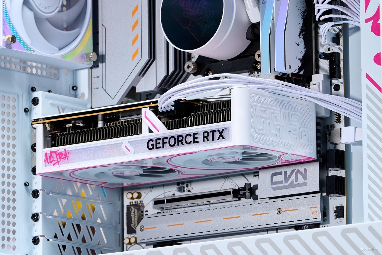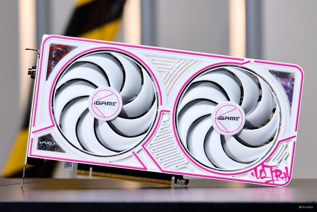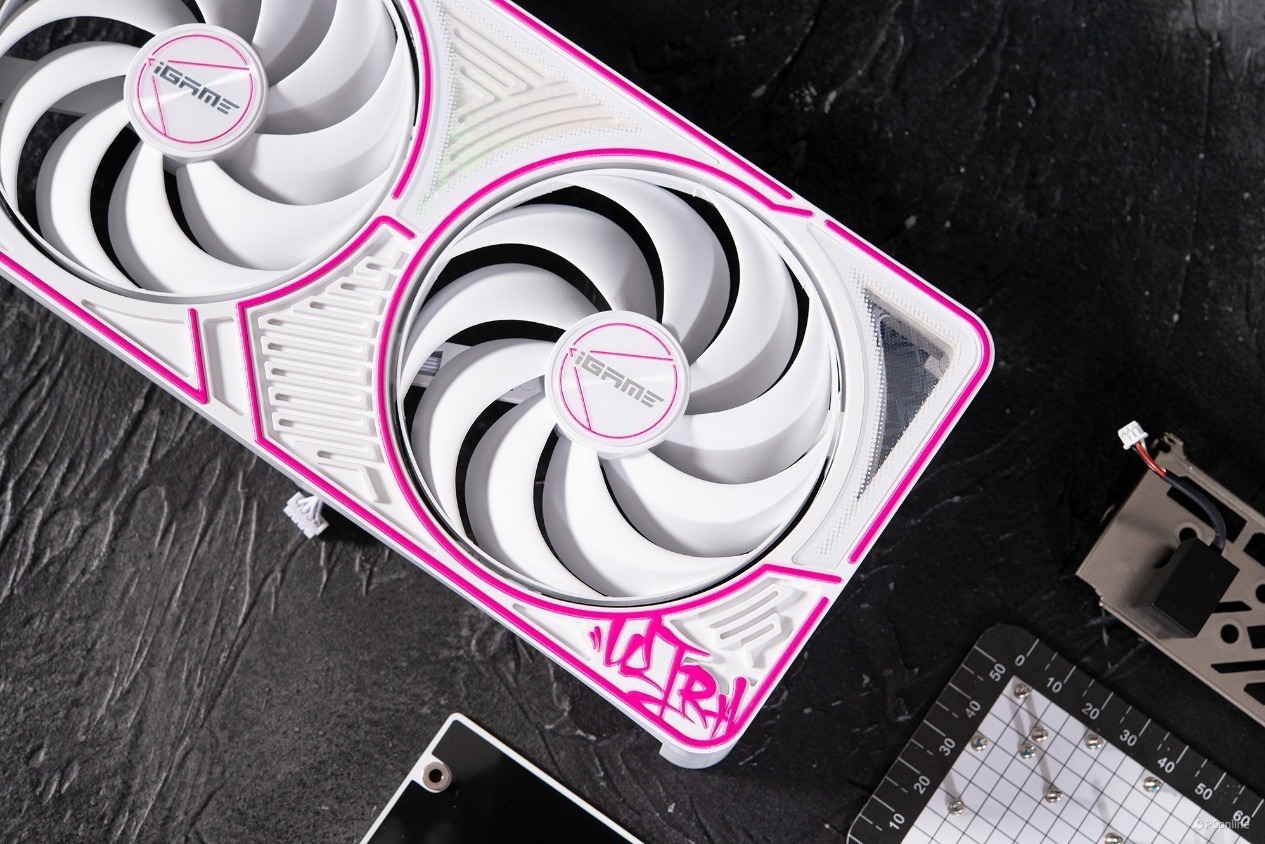 除了卓越的性能表现,iGame GeForce RTX 5060 Ultra W DUO OC 8GB的独特设计同样引人注目。趣味的嘻哈艺术风格,极富冲击力的涂鸦字体,白粉配色再加上渐变设计,颜值上非常能打。特别是配合七彩虹iGame Ultra家族全家桶一起装机时,视觉效果更佳,无论是装机展示还是游戏沉浸,都能瞬间点燃空间氛围,重新定义电竞美学的潮玩边界。颜值党选它就对了!
