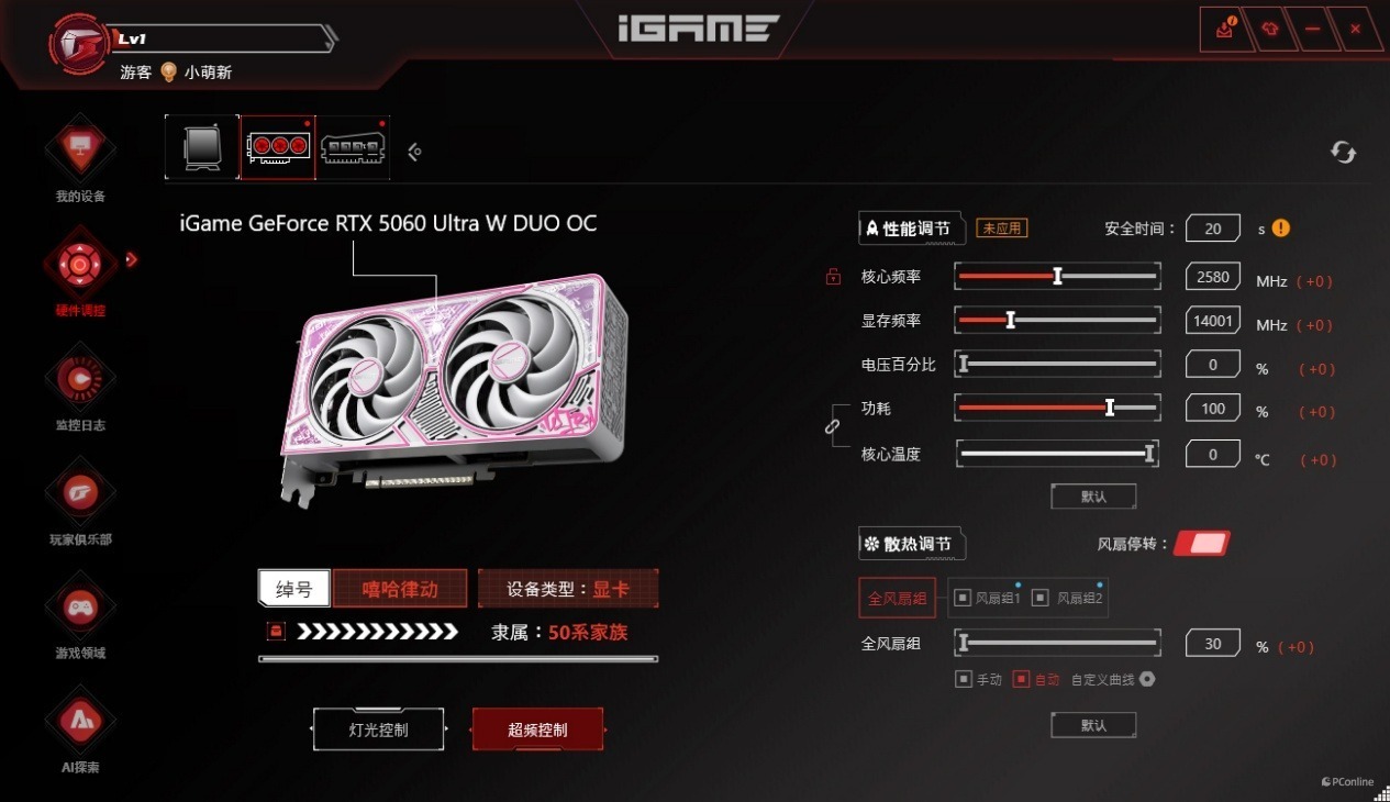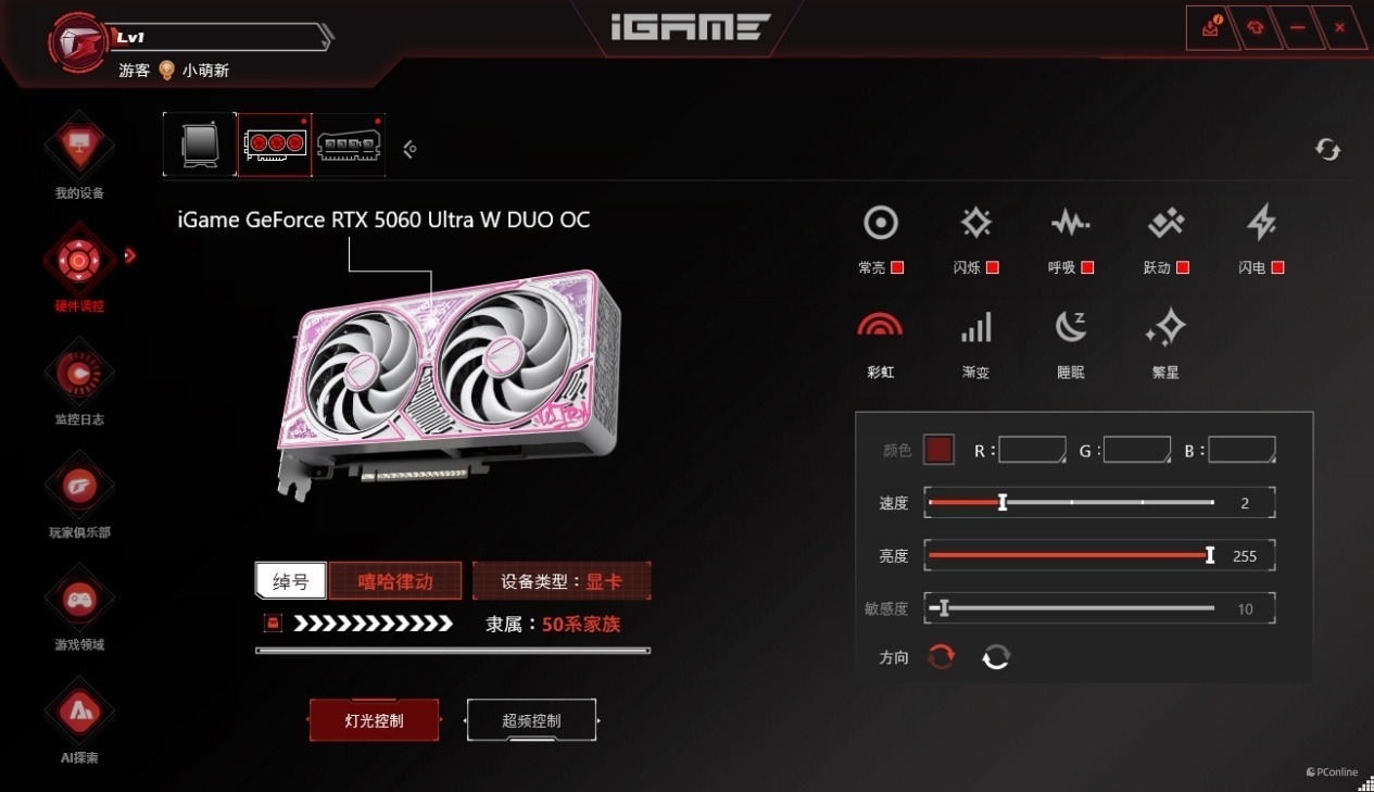针对显卡的玩法就更多了,除了能够自定义RGB灯效与其他硬件实现灯光同步之外,iGame自在星球软件还为极客玩家安排了”超频”界面与”智能风扇控制”功能。