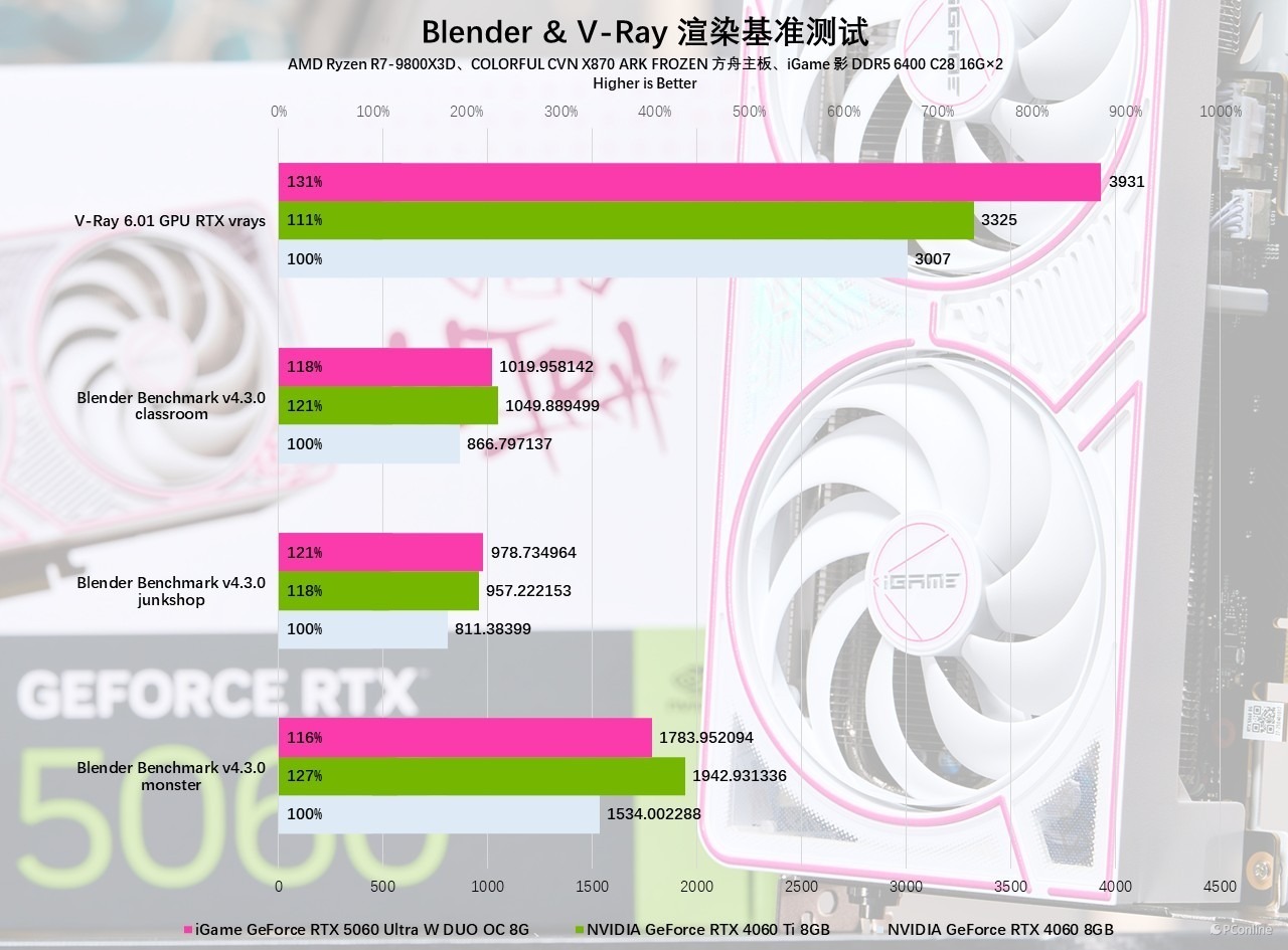 下面将要进行的则是3D渲染创作性能测试!首先在Blender以及V-Ray两款软件中,iGame GeForce RTX 5060 Ultra W DUO OC 8GB的表现再度给大家带来了惊喜,其中前者基本上能领先RTX 4060达20%左右,对比RTX 4060 Ti也能打得有来有回。而V-Ray中,iGame GeForce RTX 5060 Ultra W DUO OC 8GB可以说是大获全胜,领先优势非常巨大,对比RTX 4060,领先幅度高达30%以上,对比RTX 4060 Ti也强20%。